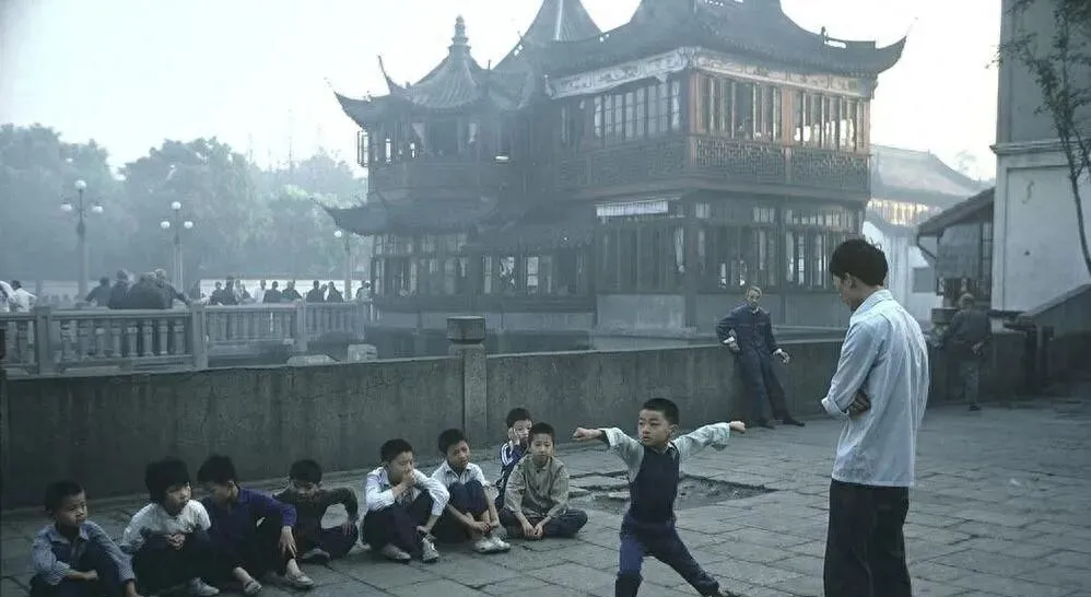 图中石栏边的空地叫练功角,穿蓝褂的男孩扎着马步比划拳法,旁边围一圈同学,老师手背在身后点着头,老房子窗棂一格格的红漆还在,雾气顺着水面往上爬,小时候上学路过这地儿,最盼就是停半分钟学一招半式,回家还装模作样给爸演一遍,他笑我胳膊慢半拍,说想打好拳,先把站桩站稳了,这话现在想想还真有用。