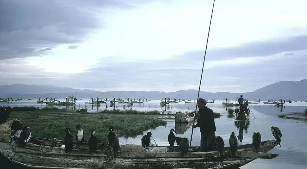 船沿上蹲着一排黑羽的叫鸬鹚,脖子细长,眼珠子亮,渔人手里一根长篙,腰后插着竹篓,口哨一响,水面抖一抖,鸟扎进水里,回来站到桩上抖翅膀,羽毛上的水珠一串一串地弹走,收工时天还没黑,篓里就满了。