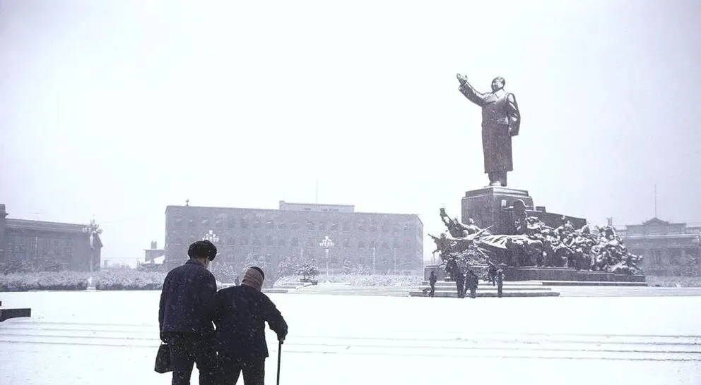 老头手里的这根叫长柄拐杖,木头直,握把磨得锃亮,雪花一片片地落,地上没脚印的地儿不多了,他和老伴肩挨着肩,走得不急不慢,像是对着前头的雕像说话,也像在和过去打个照面,这些场景呀,一合眼就全回来了。