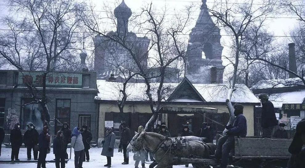 图里这车叫马爬犁,木板搭的厢,前头一匹灰马喘着白气,车辕上坐着人,街口的风一拐弯就灌到袖子里,奶奶以前总说,冬天集上买炭,最踏实就是坐这玩意儿,慢点不怕,稳当。
