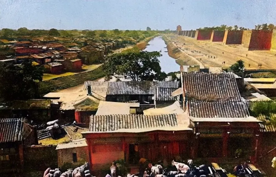 图中这一道高耸夯土墙配着一条清亮护城河,就叫北京外城的城墙和护城河,砖垛子一格一格排过来,城根儿宽厚得很,河面被风一吹起褶,像银子铺开,老辈人说城墙不光挡敌,还挡风沙,护城河夏天纳凉,孩子们沿着堤坡追蜻蜓,大人挑着担子走磴道,脚下的青土被鞋底磨得发亮,现在我们走高架桥过二环,车窗一合便是冷风,哪还有这份慢悠悠的光景。