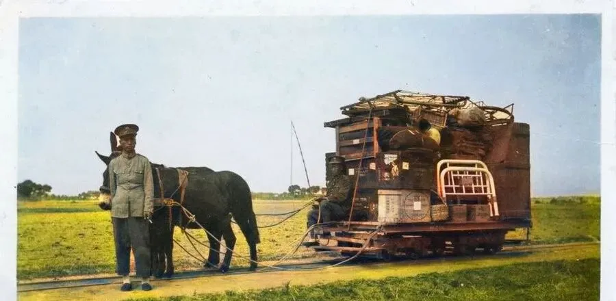 这个木架铁轮的小车叫窄轨轨车,前头一头驴,套着皮勒子,车板上捆满箱笼和床架,铁轨细细的,从草地里直穿过去,师傅一甩缰,车子就吱呀一声动了,奶奶说那会儿搬家靠它,比肩扛省力多了,现在卡车一来一去,半个小时就清空一户人家,老法子也就成了照片里的事情。