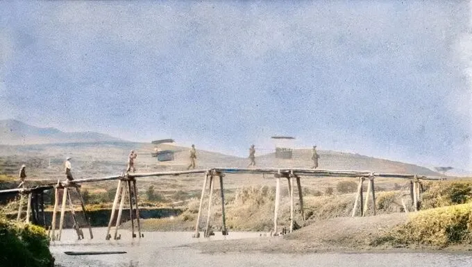 这个瘦长的木墩桥叫便桥,几根圆木撑在河心,人踩上去吱吱响,挑夫一担柴火一晃一晃,最怕半道上遇见逆行的,得侧身让一下,桥下水沙沙流,太阳把人的影子拉得老长,以前出门靠脚程,现在手机一叫车,桥名也记不住几个了。