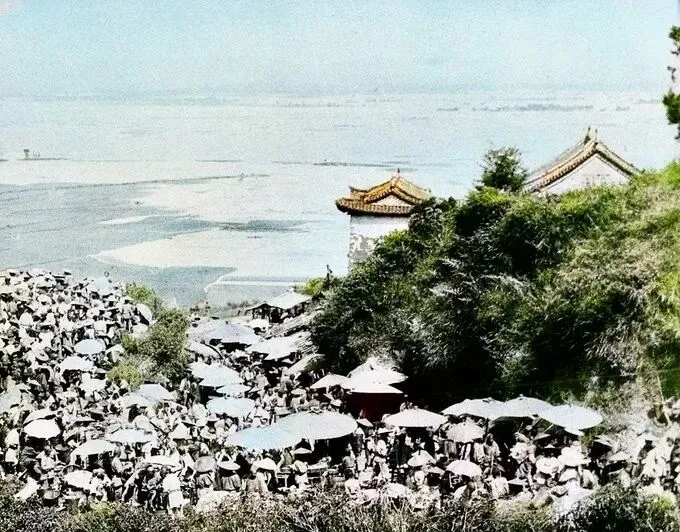 这片伞海一样的场面是海滨避暑地,姥姥叫它乘凉市,伞下摆茶碗、瓜子、冰镇酸梅汤,小贩提着铜壶一拐一拐穿人缝儿,海风把咸味送到舌尖,孩子们脚丫在沙里扑腾,笑声顺坡往下滚,现在夏天我们空调屋里追剧,倒忘了海的味道也能当饭吃。