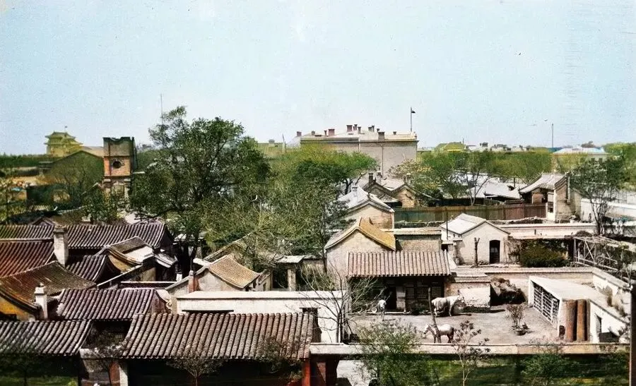 这片红瓦灰墙的屋顶群就是使馆区一角,旗杆上头的旗子懒洋洋地飘着,房舍规整,院里竟还拴着两头骡子,外国教堂的钟楼远远立着,母亲说那里原来走路都要小声点,怕惹事,现在这附近成了景区,游客端着相机找角度,旧事被标牌解释了又解释。