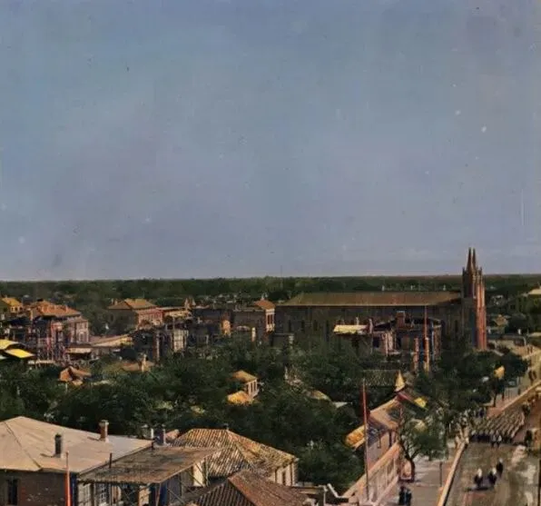 远处那座尖顶的叫教堂,旁边的路直直通向天边,路边店铺屋脊连成一条锯齿,阳光一斜,墙皮像被刷了蜜,爷爷说他年轻时第一次见洋房,惊得摸了半天砖缝,嘴里嘀咕着这砖真细啊,现在我们见多了钢玻璃,细节倒懒得看了。