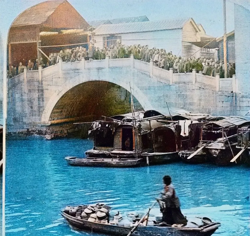 这座大石拱桥桥肚圆圆,桥面挤满看热闹的人,水下停着一群棚船,前景的小乌篷摇着桨,船舱里码着坛坛罐罐,船家肩一努,船头就拐了个弯,江南的水是会说话的,白天卖陶夜里泊岸,灯火像碎银子撒在水面上,现在河道灯带一亮,倒也好看,只是人情味淡了点。