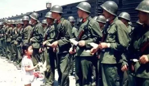 图中这一幕叫出征授别,小女孩把一只只纸包递到战士掌心里,浅粉的裙子、乱蹦的马尾、攥得皱巴巴的小礼物,和一整排头盔发暗的绿色身影对在一起,反差大得让人鼻子一酸,妈妈在旁边小声说别怕别怕,叔叔们很快就回来,战士笑着摆手不敢接,转头再接过来,轻轻塞进衣兜里,像收了家里的叮嘱。
