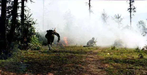 这张叫趁烟抢线,白雾压在地皮上,前面的影子扑着跑,后面的影子半跪半趴,教导员吼一嗓子别停,脚底下尽是树根和石碴子,裤腿被露水一糊,湿得贴肉发冷,心却烫得像炉膛。