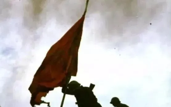这一帧叫冲顶插旗,旗杆斜着上去,身影更斜,风把旗边扯成锯齿,云压得低,后面人影跟着扑,等定住脚,倒下的那位手还攥着杆子不撒手,战友把他手一点点掰回去,红旗在风里抖,就像心口在抖。