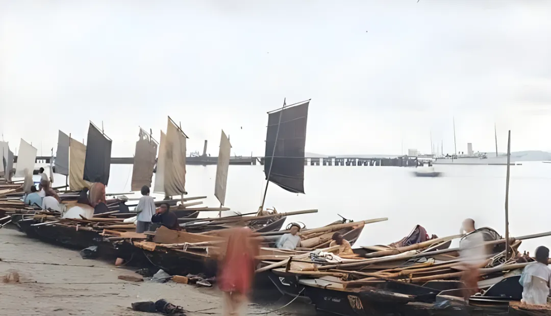 这个瘦长肚皮的木船叫舢舨,窄口宽底,桅杆上挂着素帆,黑白灰三色随风发抖,船工歇在舱沿,手里还攥着麻绳,海面平得像一张纸,远处码头冒着白气。小时候我在河边看划子练桨,总学不来那一下稳准的入水,师傅笑我说,桨叶下去别着急,先让水服你,再让船走你,这句话我记到现在。