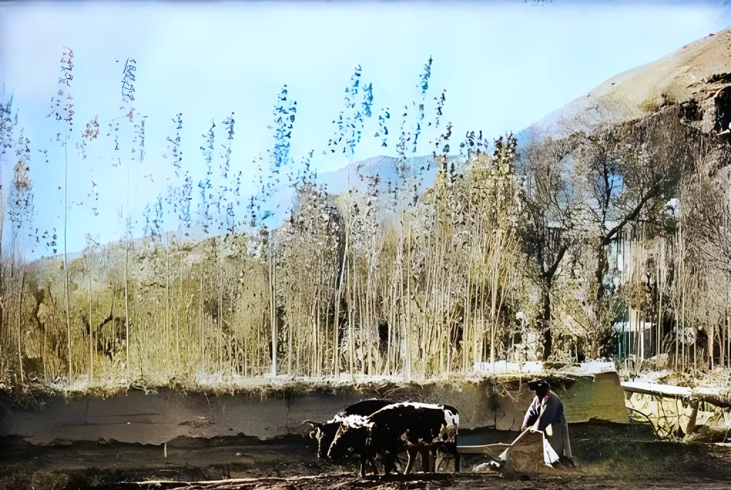 图中这把木犁鼻子朝下叫曲辕犁,牛脖上挂青绳,犁铧切土的声音闷闷沉沉,地面翻起细碎的土坷,阳光照得发白,农人身影被山风拉长。爷爷说,顺坡开沟,回头一望,直不直全看手上劲儿,后来来了拖拉机,犁就靠边了,可一块地要认脾气的讲究,什么时候都不算陈词。