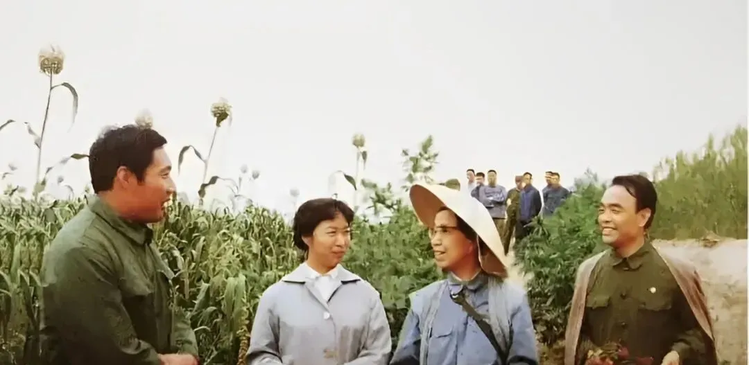 这个场景叫下乡走访,田里高粱穗子正鼓,脚边是土坎子,几个人边走边说,草帽檐子投下一小块阴影,布质挎包斜在胸前,远处还有几位跟着走的同志,小时候跟着姥爷去地里,最爱看人围着聊种法,汗顺着脖颈往下淌,衣角一拎就能甩出一道弧线,现在城市里说丰收,多半看的是数据,泥土味儿淡了不少。