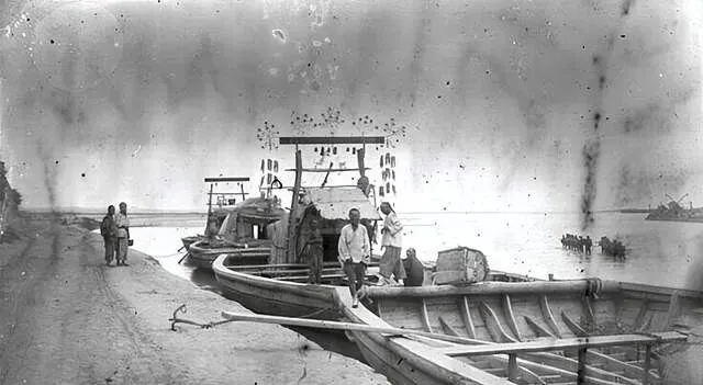 这排木船肚子圆,篷架上挂的旗样物件晃悠悠,船头一根橹躺着,水边一条窄路踩得结实,搬煤的汉子腰上勒着布带,黑灰蹭得面上花花的,现在煤车呼啦啦过桥,河面清静多了。