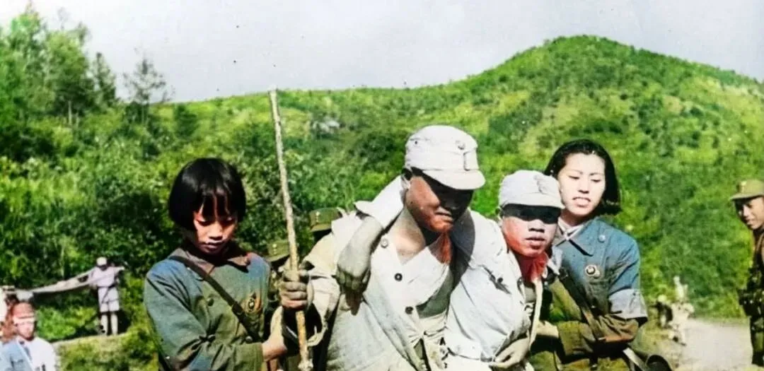 这个场景叫前线救护,图里几位医护穿着带扣子的蓝灰外衣,袖口卷得高,肩上搭着纱布,抬着的是国民党伤兵,腰间绑着木夹板,血把白布染成红的了,路不宽,石子硌脚,他们就拿小木棍探着走,怕踩空,怕晃到伤口。
