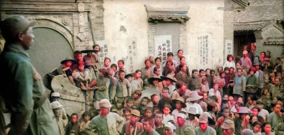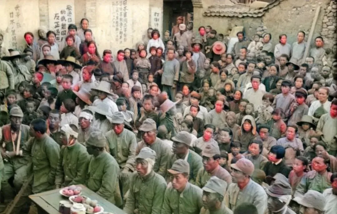 这个大院里热闹的场面叫座谈会,桌上放着粗瓷碗和几盘花生,墙上糊着口号纸,穿灰绿军装的坐一排,旁边是戴白头巾的邻里乡亲,几个日本兵放下枪坐到人堆里,低着头听翻译一句一句讲,大家不是喊打喊杀,而是说个理,讲个心。