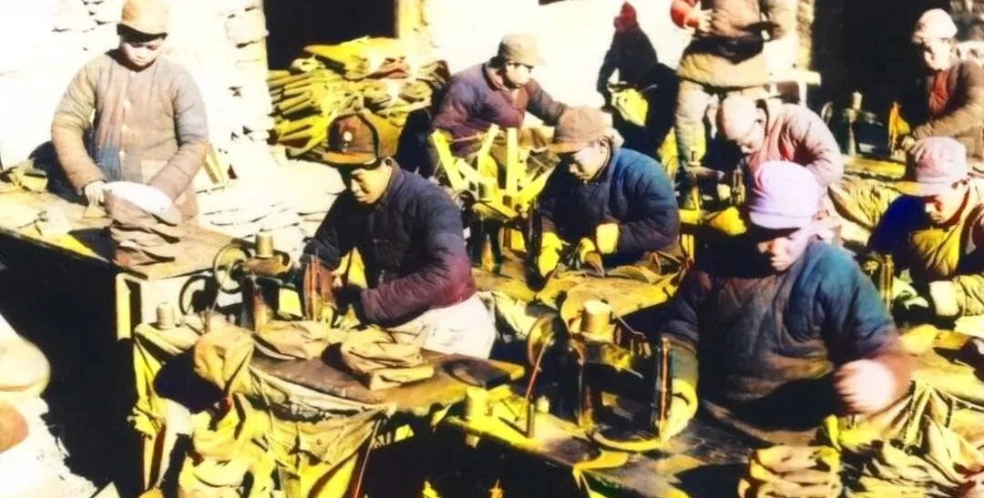 图中这排嘎吱作响的脚踏机叫缝纫机,机头漆成黑金色,飞轮转起来闪着亮,桌上堆的是棉布、呢料、破旧军衣拆出来的边角,师傅们手上戴线箍,脚下踏板一上一下,针脚像小兵站队,一行一行往前走,帽子袖筒全从这儿出来。