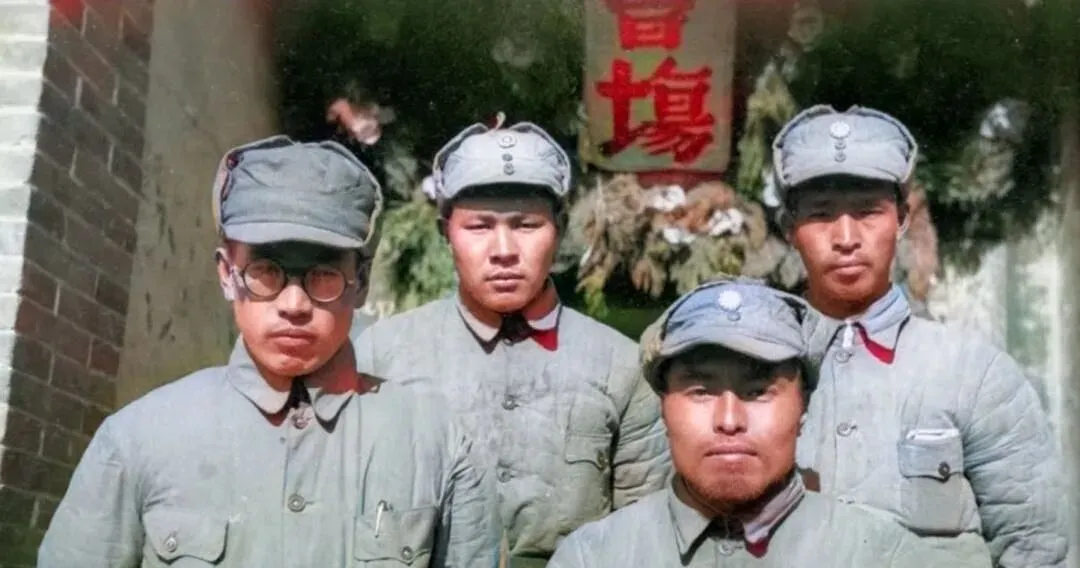合影这张最好认,红漆门框上挂着“会场”两字,四位穿整齐的人站成一列,帽檐压得低,胸前扣子亮,表情不夸张,像是刚从会里出来的认真劲儿还没收住,那会儿拍照不讲究造型,站直了,睁眼看镜头,留个念想就行了。