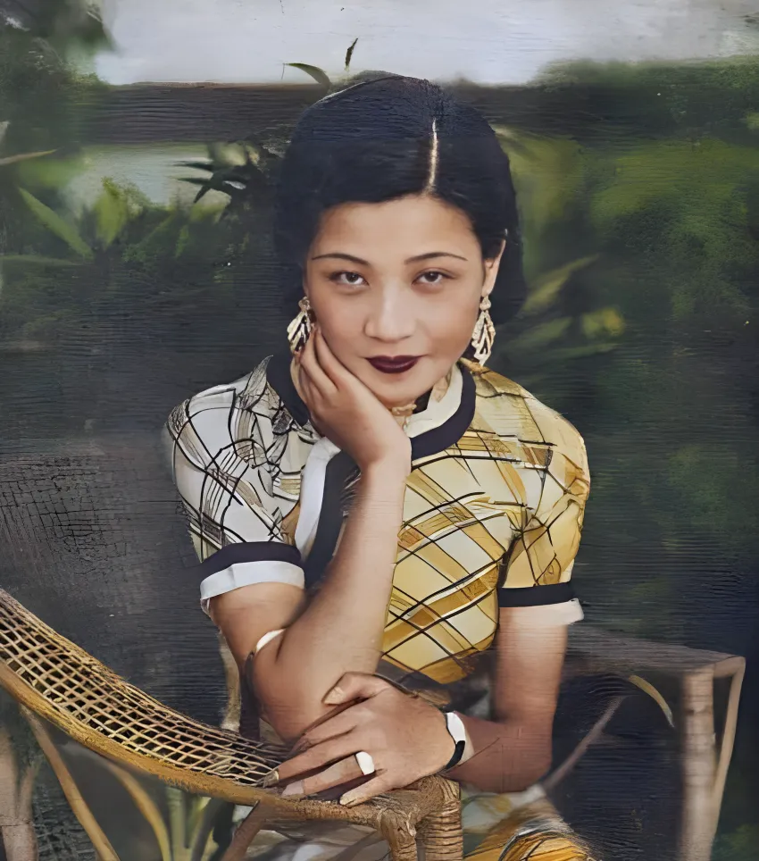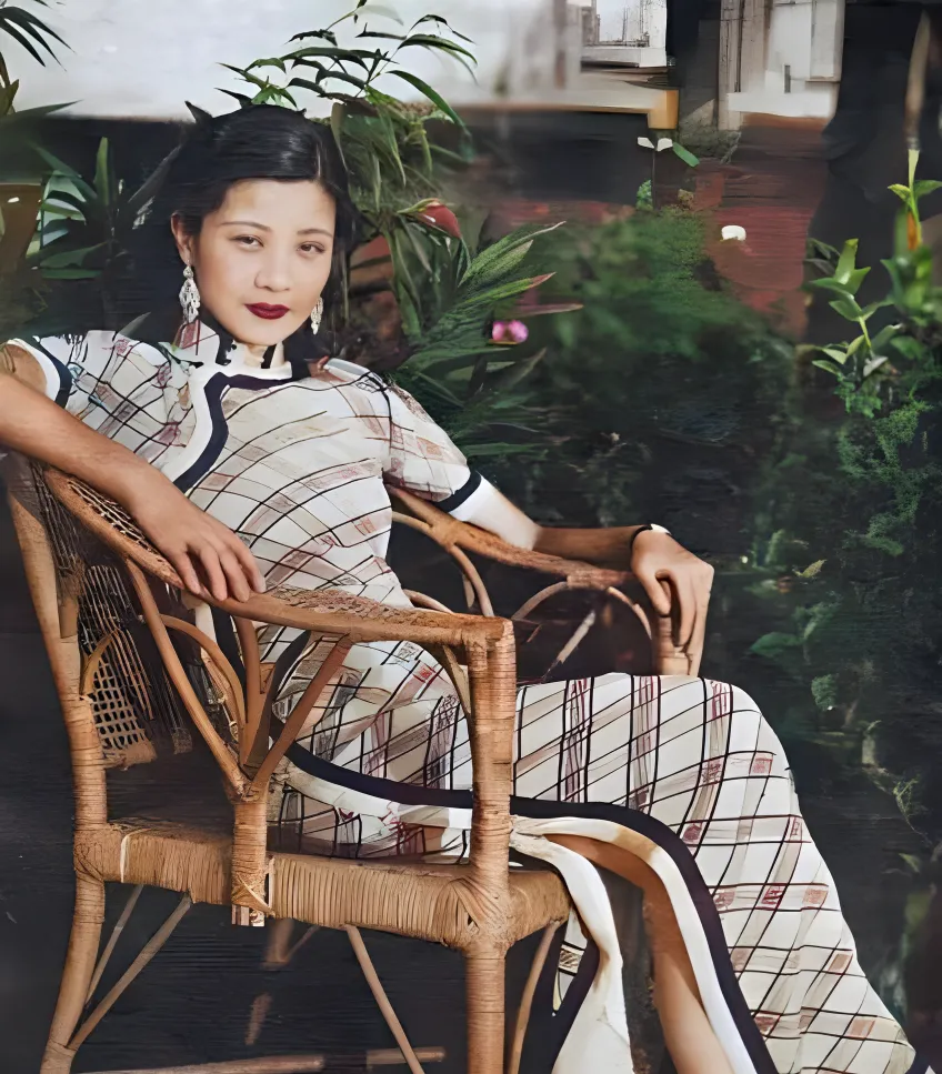 这件格纹旗袍是细线抽格的款,米青底子压黑线,坐在藤椅上,靠背有点散口,这是老藤的味道,胡蝶一只手搭着扶手,手腕戴扁圈手镯,海风味儿十足,以前街坊里说她的旗袍**“一寸一戏路”**,这话不假。