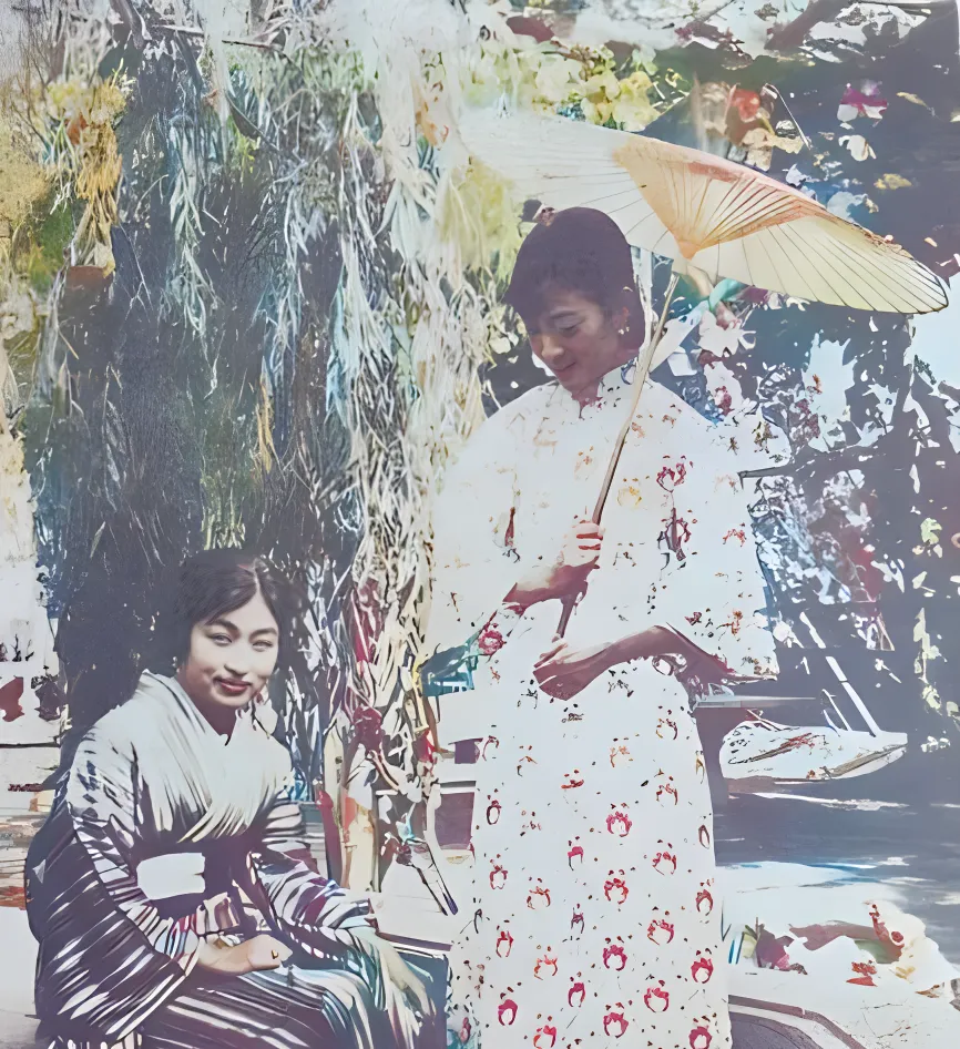 这一帧其实是同场再来一张,伞边的粉晕更轻,坐着的那位束带明显,纹是横细条,细看还带一点金粉,老照片上色最难的就是这点亮,一重就腻,一轻就没劲,这里拿捏住了。