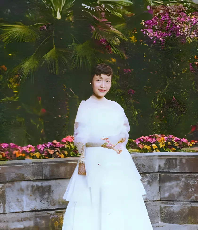 这个白裙叫洋装礼服,团扇似的披肩绕肩,腰间扎着细带,背景花架层层叠叠,笑容往上一挑就干净,我记得小时候过年照相,妈妈也爱在胸前搭条白纱,说白能托人气色,现在手机滤镜一抹,倒没这份手工的讲究了。