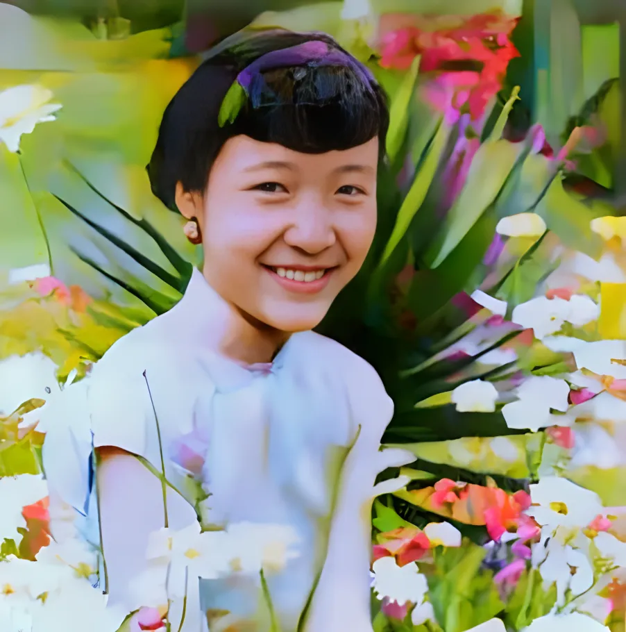 这张靠近,脸颊有梨涡,耳钉是圆珠,花团里那点黄绿跳得欢,照片不大却有春天的响动感,这种近景要是对焦一虚就废,这张咔嚓得干净,看着就舒服。