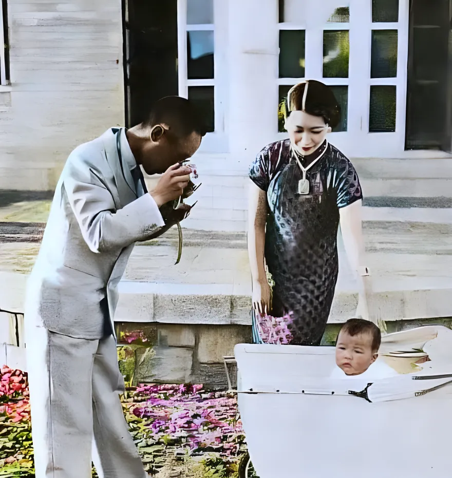 这张最有人情味,婴儿车是大肚子的欧式车,边沿滚白线,男人弯腰举机,女人低头看孩子,谁家不是这样呢,先不管身份如何,镜头里都是一家子的小欢喜,姥爷当年也有个黑匣子机,逢年必给我们摆拍两张,他说留影就是给以后的自己看。