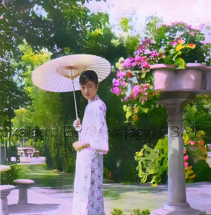 同一组里再换一个角度,伞缘的阴影压在脸侧,五官被轻轻推出来,背景里的花钵子层次更清楚,老影楼师傅就爱这一手,一阴一阳,面中见骨。