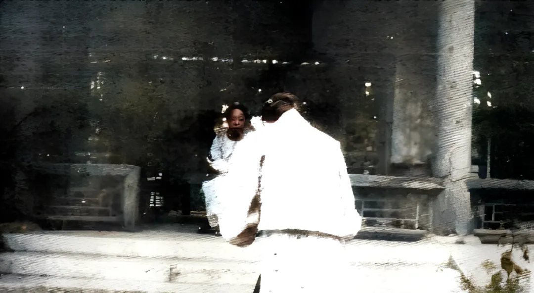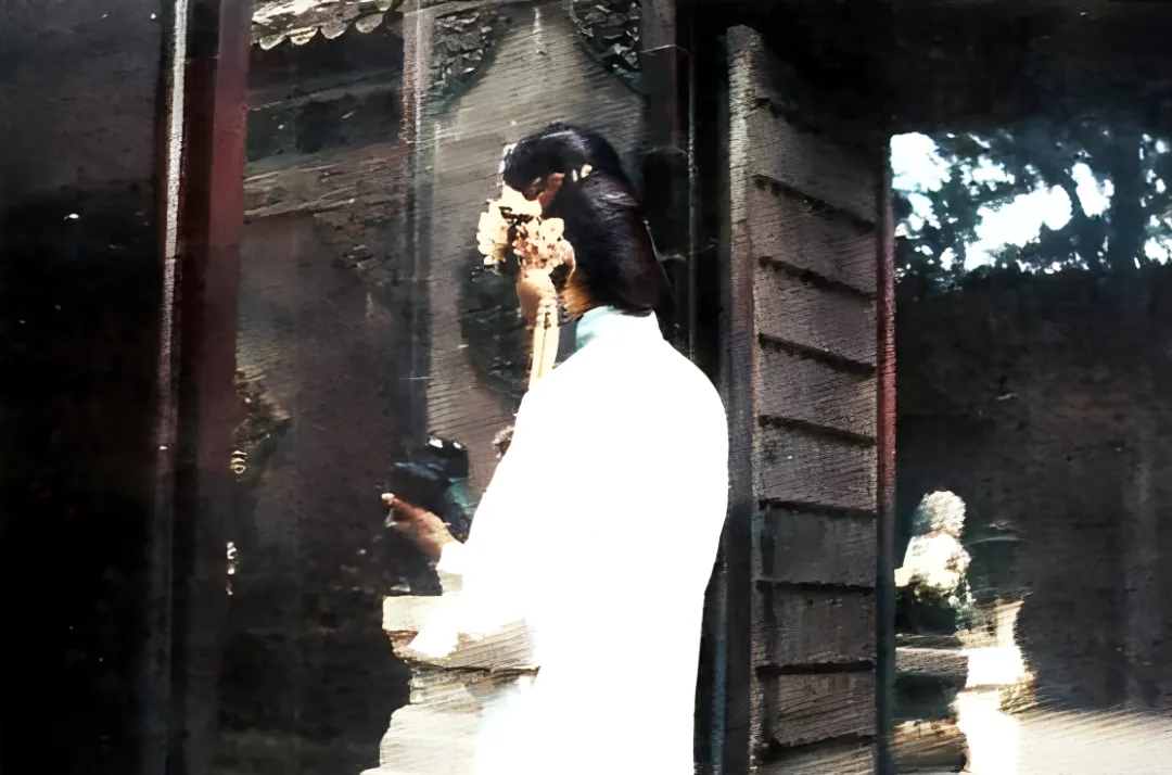 这个场景光线吃紧,人物穿素衣,步级台面粗糙,边上还有石缸,叫宫苑照相练手,拿在今天也算抓拍了,模糊里带点真实,像是刚学会玩相机的人试景。