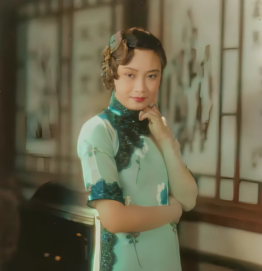 这件青绿底子上压墨色贴花,短袖,立领,腰线收得紧,背后是格窗,手撑着下巴,笑里有点坏,这类内景最显布料的油光,老上海的中西合线,就落在这一领一袖上。