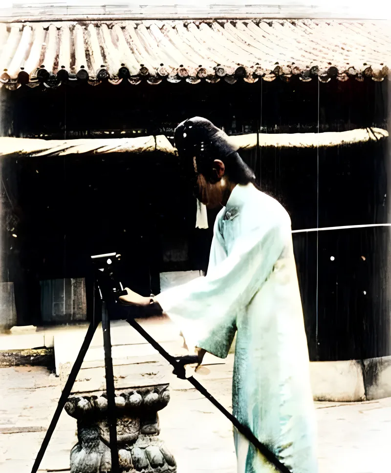 看着像在摆弄三脚架,院子里瓦当清楚,手指拧旋钮的劲儿都能想象,过去相机慢,按下去得等一会儿,风一动就虚,所以拍照前要喊一句别动,家伙事儿多,但出片有味儿。