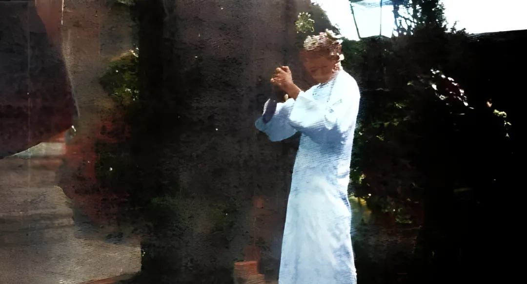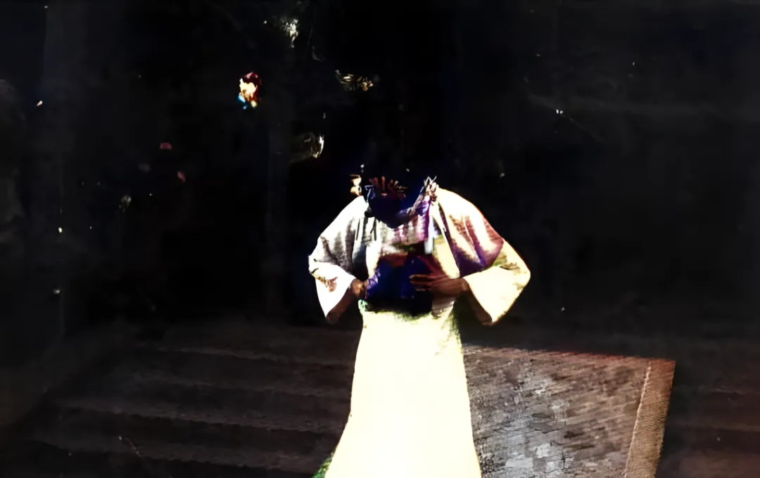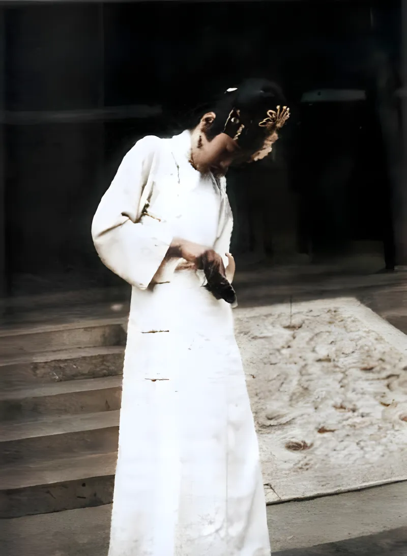 人低着头像在抖落什么,素衣长到脚面,门边的阴影吃人,照片没说话,反倒让人想多一点,这是老照片迷人的地儿,空白也能讲故事。