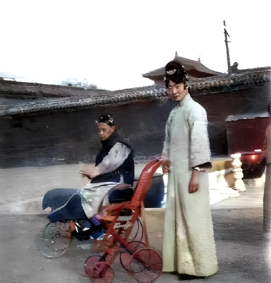 后面坐着的婆子望过来,前头的小车刷了红漆,轮子胖,地上有一点潮光,旧院里的日常味儿最耐看,没有摆拍,都是活生生的光景。