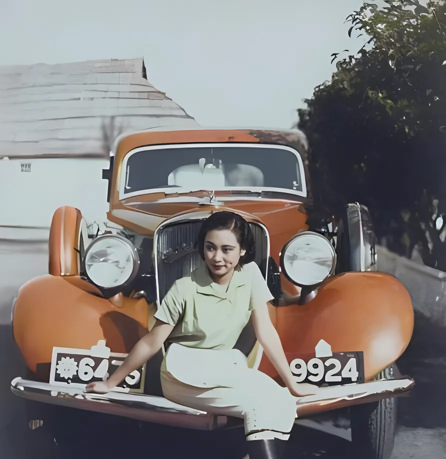 这张太“摩登”,橘红车头鼓鼓的,镀铬保险杠亮得晃眼,胡蝶坐在杠上,白裙摆垂着,笑得机灵,以前人要学开车不易,现在手机一伸就是自拍,当年的气派,全落在铁皮的光上。