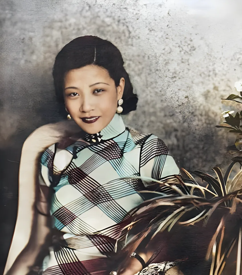 这张格纹比胡蝶那件更疏,黑线在浅青底上拐成弧,珍珠耳环圆圆的,阮的笑是往心里收的,不张扬,老杂志常用这类半身照当封面,一看就识人。
