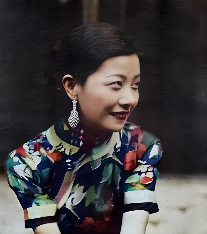 这张更松弛,花色旗袍用了大面积的碎花,耳坠是叶脉形的,光一勾,边线亮醒,人物偏侧坐,笑得不满,像跟摄影师打趣,那时候拍照不高冷,讲究坐有坐相,话里带笑。