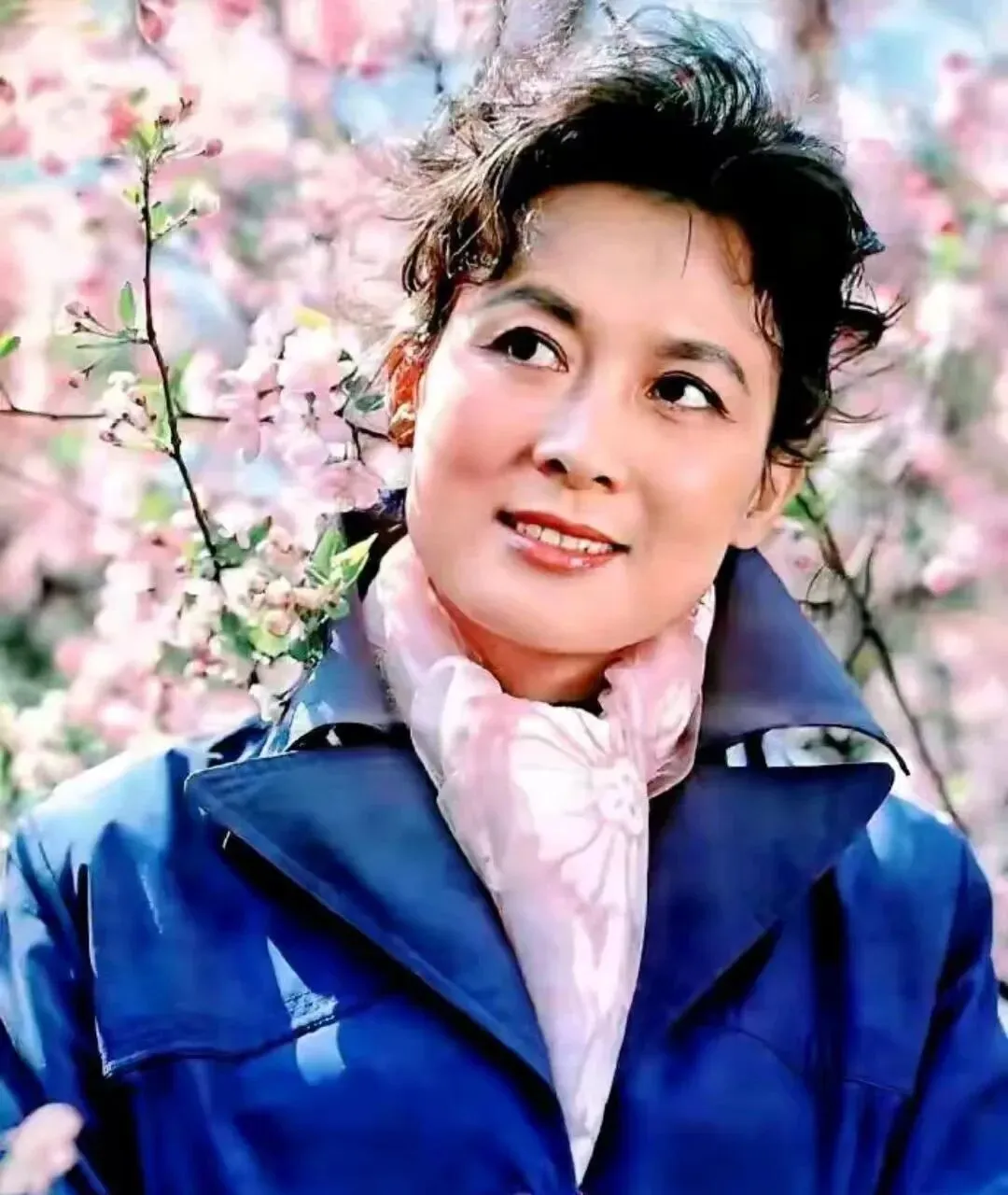 蓝色风衣叠丝巾,背后是开得正好的海棠,脸上带风,笑容不急不缓,像乡镇企业画报里的先进标兵,妈妈说当年单位组织看电影,大家都学她围丝巾的法子,一条巾就能提气。
