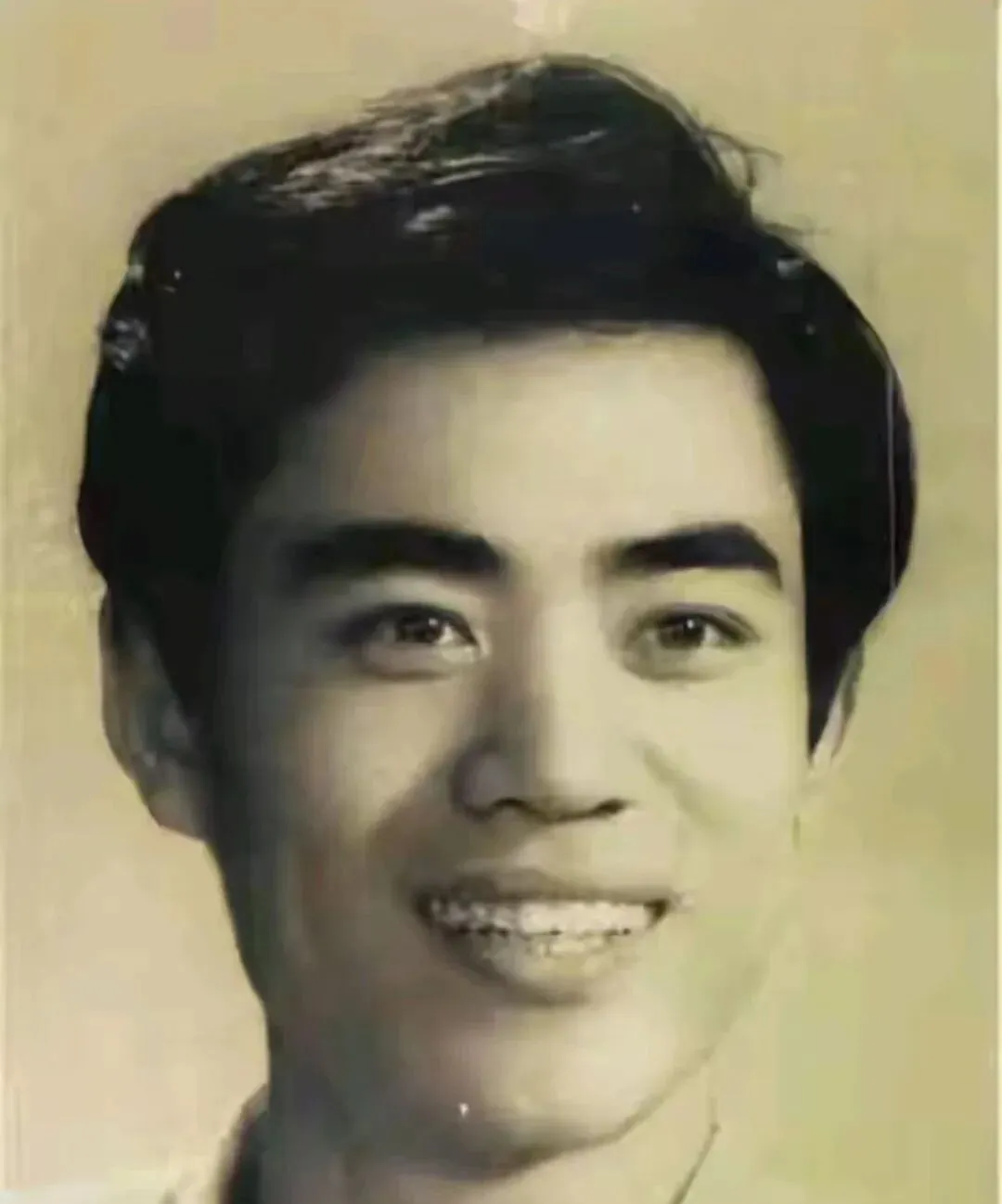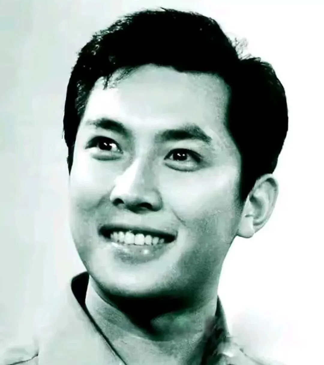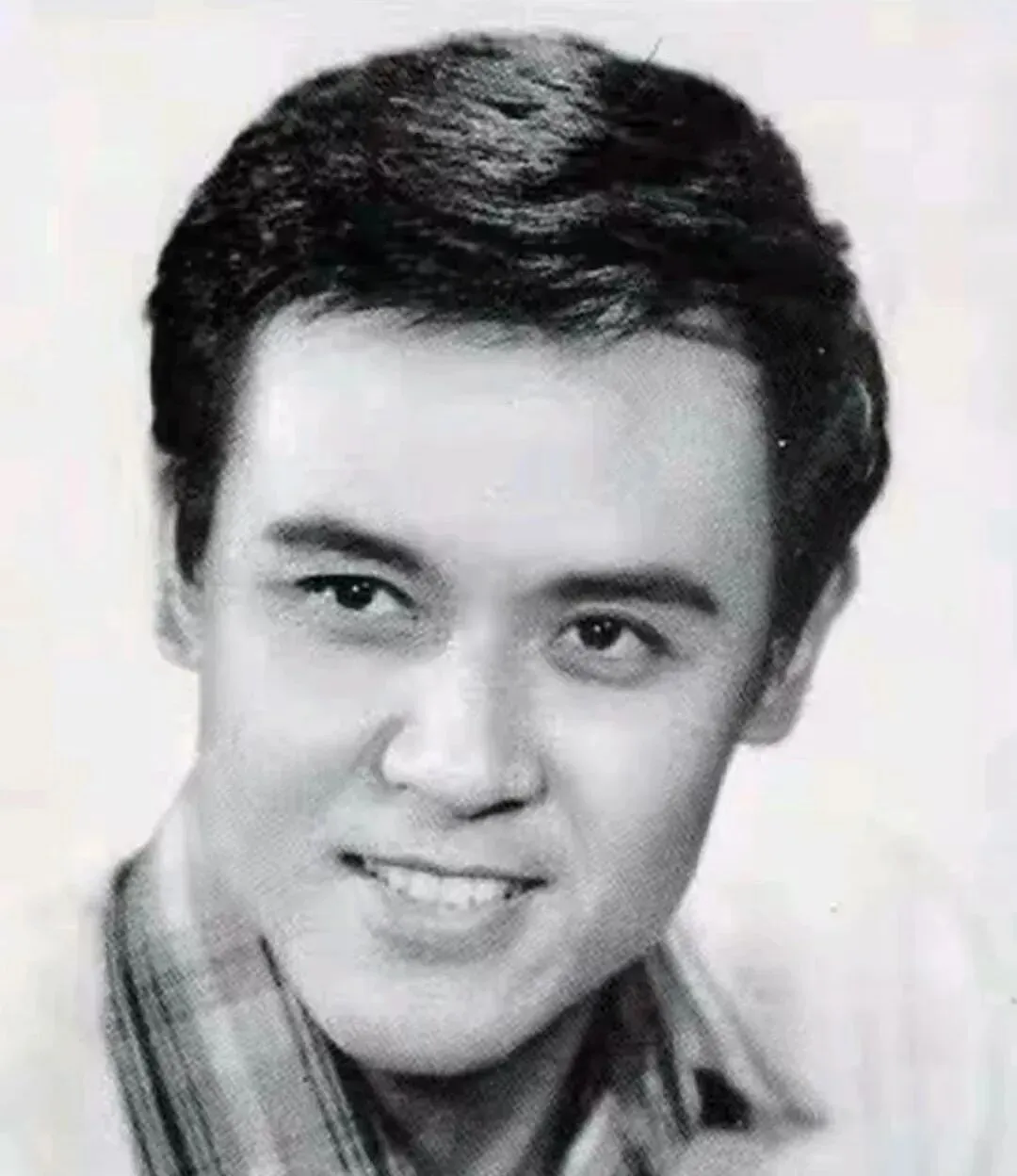 图里这位小伙子的眉眼真干净,黑白底片把鼻梁和颧骨勾得分明,发型是那个年代最流行的蓬松油头,鬓角修得利索,笑起来露一排整齐的牙,像从文工团里刚出来的俊小生,妈妈看见这张就感叹一句,当年同款发油一梳下去,谁还不是个精神小伙。