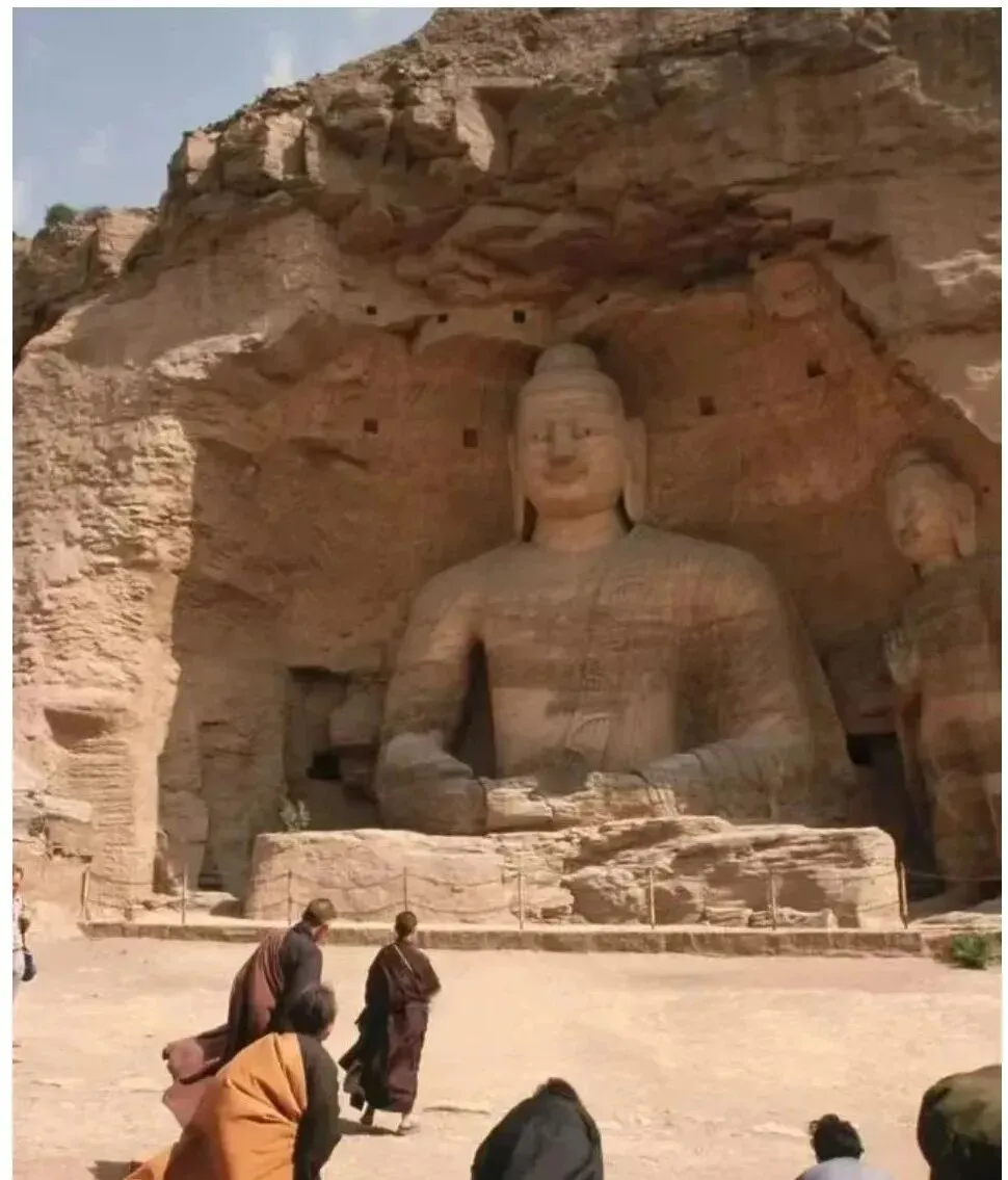 图中这尊大佛就叫石窟佛像,面相方正,鼻梁挺直,耳垂垂下到肩头,粗粝的砂岩皮理像岁月一层层刷过去,僧人披着袈裟,迎着劲风一步一步走近,衣角翻起来的那一下,像把肃穆按了个印,小时候我第一次看见这么大的坐像,忍不住在心里嘀咕,这手掌要是合上,得把整个人都护住吧。