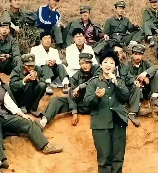 这个场景叫前线慰问,女兵拿着话筒站在土坡上,身后战士席地而坐,抽烟的、笑的、眯着眼听的都有,歌声一压一扬,像从沟壑里升起来的风,妈妈看这张图时笑着说,当年一曲唱完,战士们抢着把野菜包塞你兜里,热乎劲儿能护着人一整年。