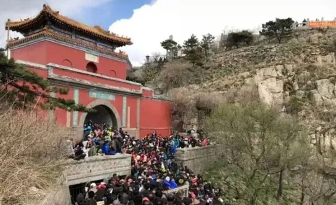 对照看这一张,就是如今的景象了,朱红的墙,琉璃黄得发亮,门口黑压压的全是人,导游旗在头顶一摇一晃,队伍像长龙盘在山腰,以前人少的时候,能听见山风敲松针的声儿,现在热闹也好,说明大家都愿意走出来看看世界。