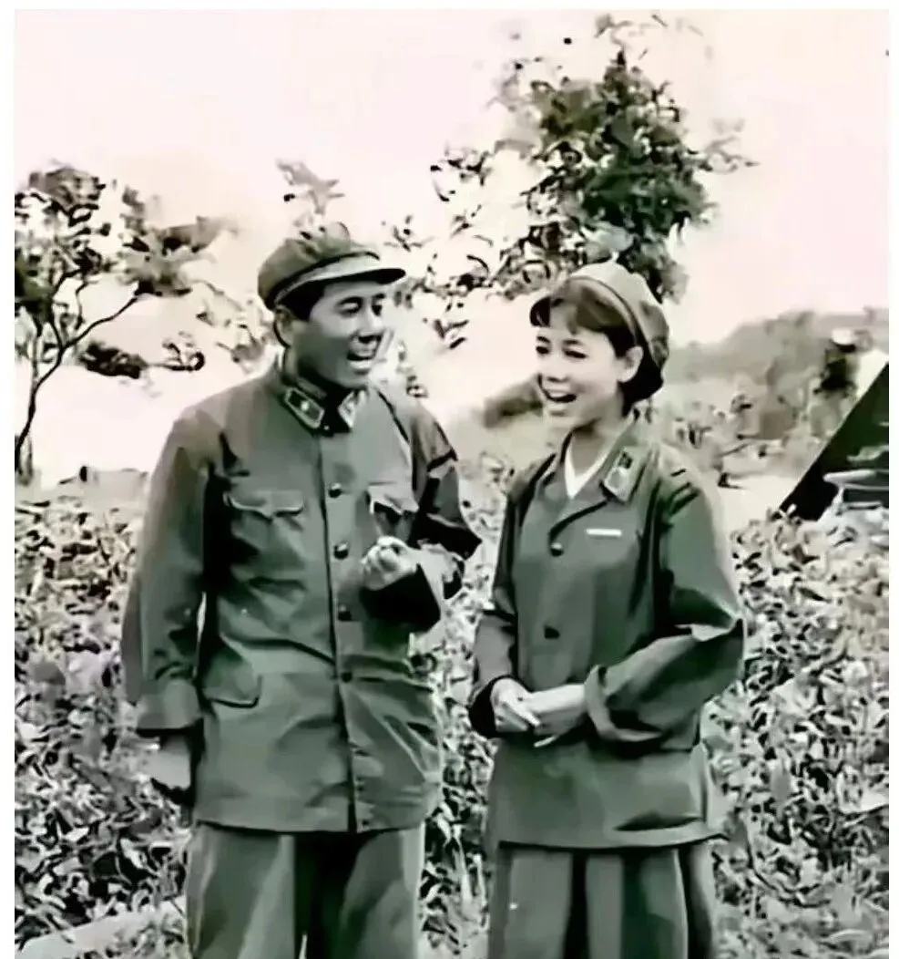 这张黑白剧照叫并肩笑,男女兵站在灌木边上闲聊,袖口挽到手腕,牙齿在阳光下一闪,笑得一点不客气,台词没听见也能猜到,准是互相打趣的那几句,朴素的布料把人裹得利利索索,心气儿全写在脸上。