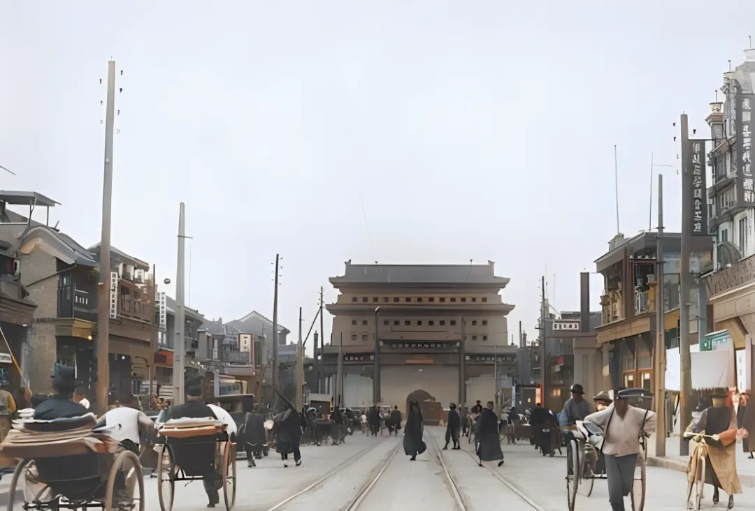 这个气派的门楼叫城门,前门大街的轨道在中间伸过去,两边人力车窸窸窣窣地跑,拉车的戴着帽子,手腕绷着筋,电线杆高高直直地插在天里,老爹说这条街可讲究中轴线,走在正中间像走在规矩上,那时热闹归热闹,摊贩分明,买布的买布,卖糕的卖糕,现在商业街也热闹,可都是一个味儿的连锁招牌,少了这股子各自开张的人情面儿。