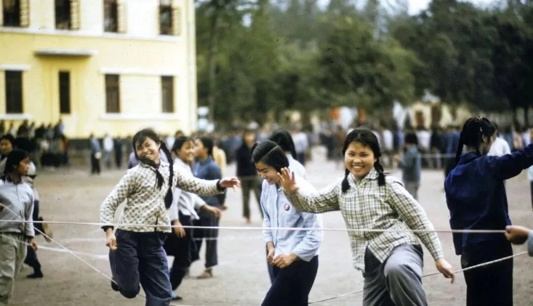 这群笑开花的女生在玩跳皮筋,两根皮圈儿绷得直响,抬脚跨、并脚跳、交叉绕,动作一套紧一套,我妹妹看见照片喊着也要学,我说现在有操场有跑道,想玩就玩去,那时候一根皮圈能玩整个下午。