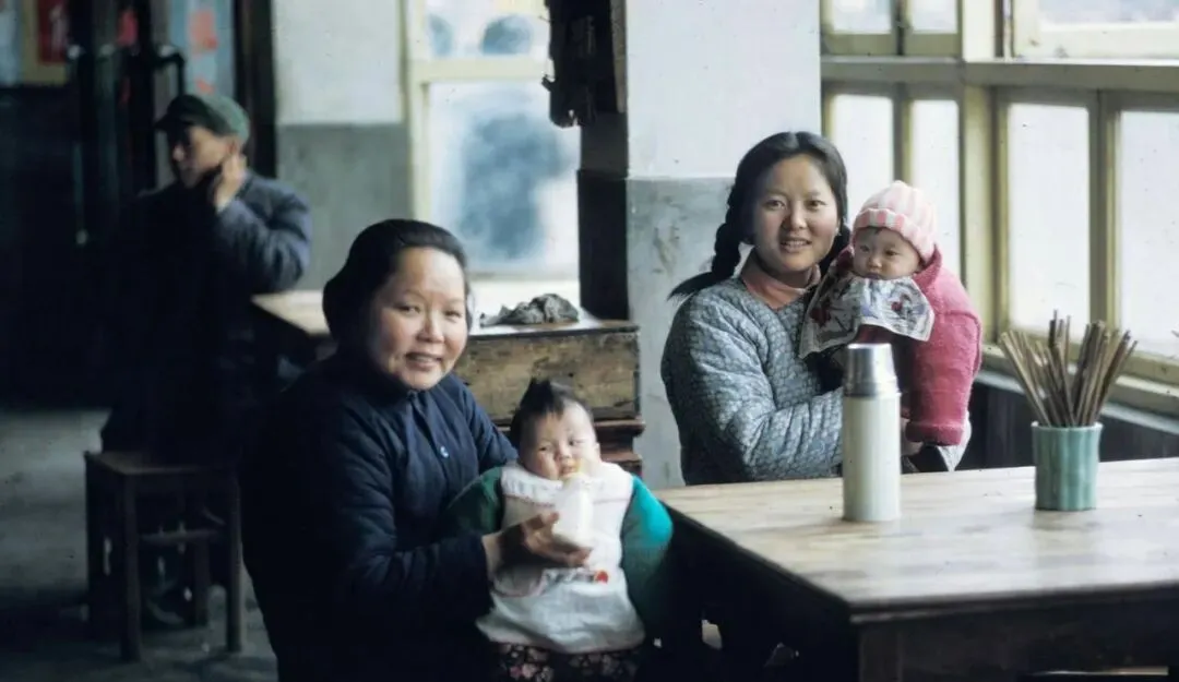 桌上搪瓷暖壶白得亮堂,外婆给娃娃喂奶,女儿怀里抱着另一个小家伙笑眯眯的,灶台后边有人吆喝加汤,我凑过去看了眼,碗边蹭着一圈油亮的葱花。