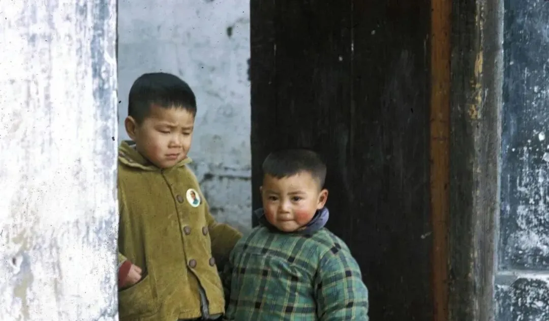 这两个小家伙一个穿呢子小黄褂,一个格子棉袄,哥哥攥着弟弟胳膊不让乱跑,脸蛋冻得红扑扑的,奶奶在旁边打趣,说家里有俩这样的,闹也甜。