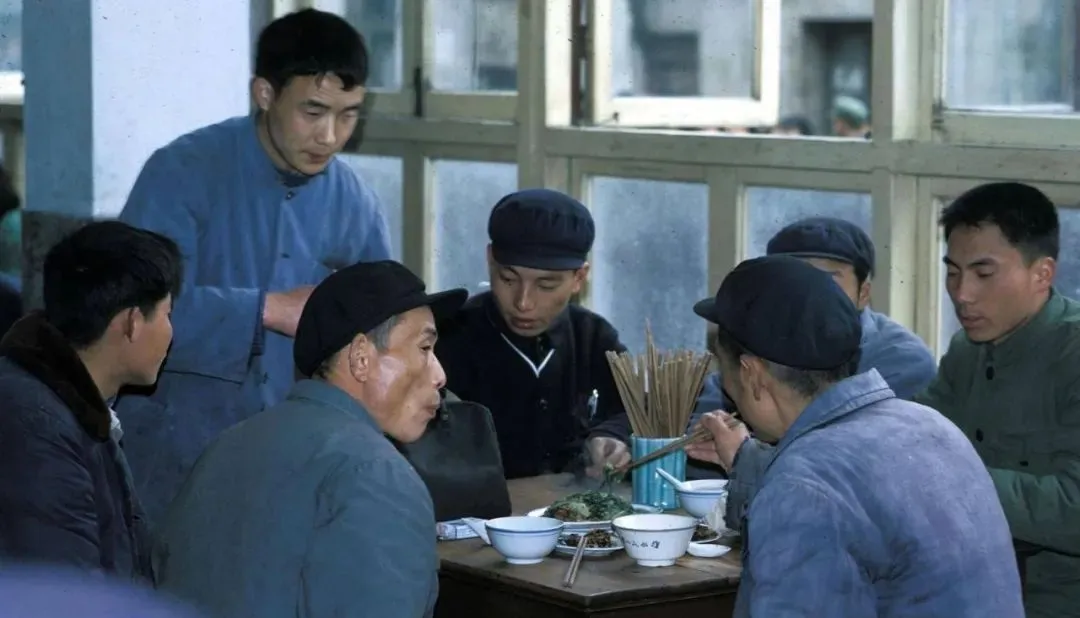 这桌上筷桶是搪瓷绿的,碗沿印着店名,几个人对着一碟小炒你一筷我一筷,服务员低头报账,口袋里露出记账本,便宜不便宜,心里都有杆秤。