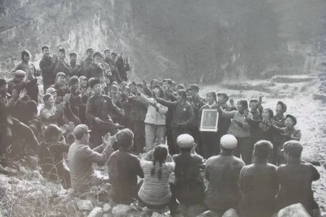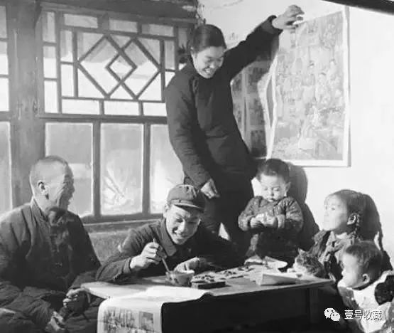 ▼ 新年了,“总把新桃换旧符”,“学习先进经验”是极具那个年代风采的横幅。那个时候,“能不回家就不回家”成了新的宣传口号,干部们纷纷下到工农家庭给大家伙儿拜年。下图就是一位老书记在去农家拜年时,帮忙张贴春联的场景。