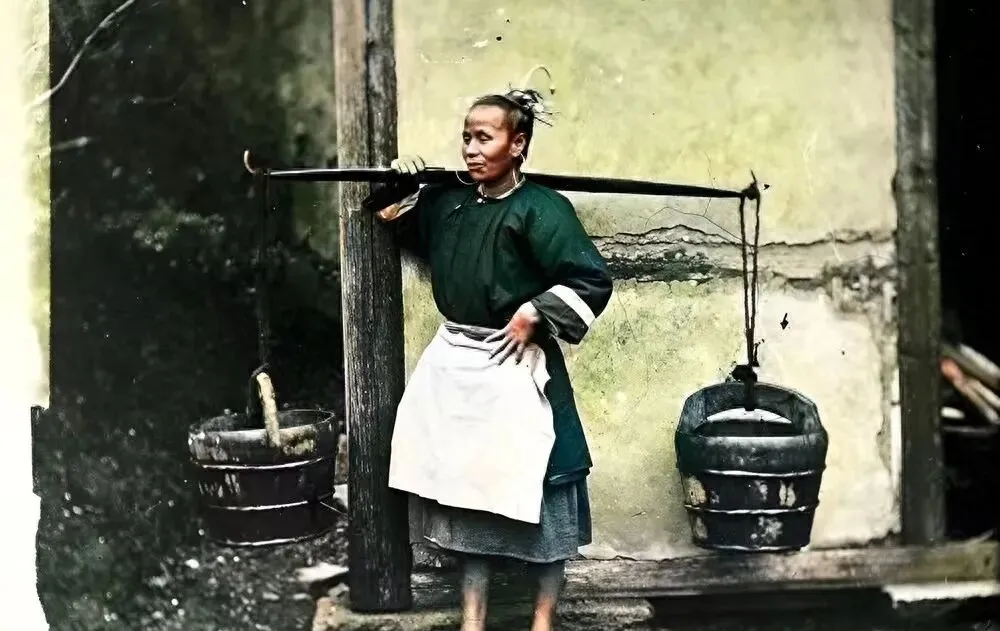 图中这位挑担的叫汲水妇,肩上的木扁担黑亮黑亮的,八成是被汗水和手茧磨出来的油光,左右两只木桶一只带铁箍一只粗木条当提梁,走起来哗啦一声水面打着浪,衣裳是深绿短打配白围裙,干净利落不拖泥带水,她站在屋檐柱子边,歇一口气手还搭在扁担上,像随时要再走一程。