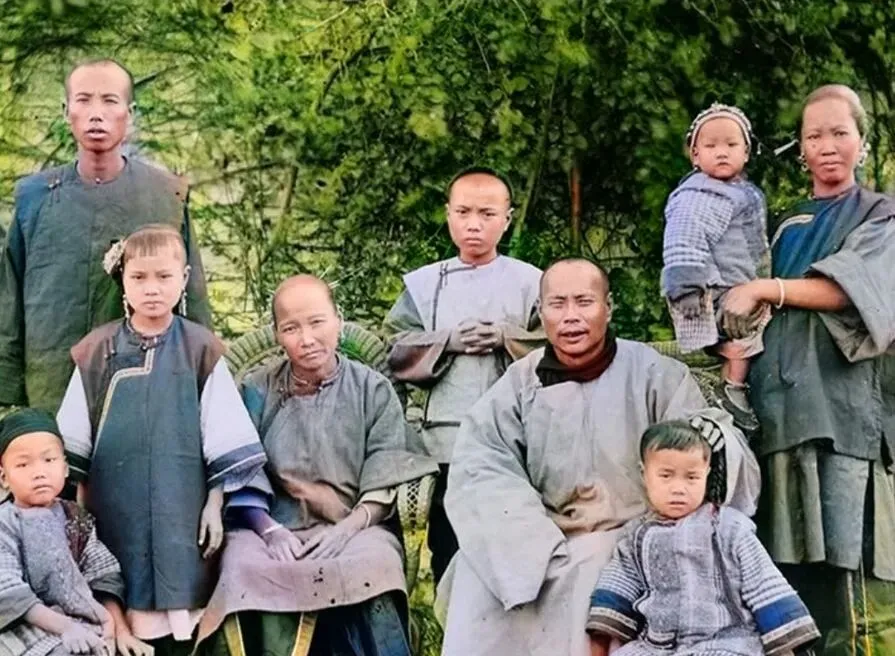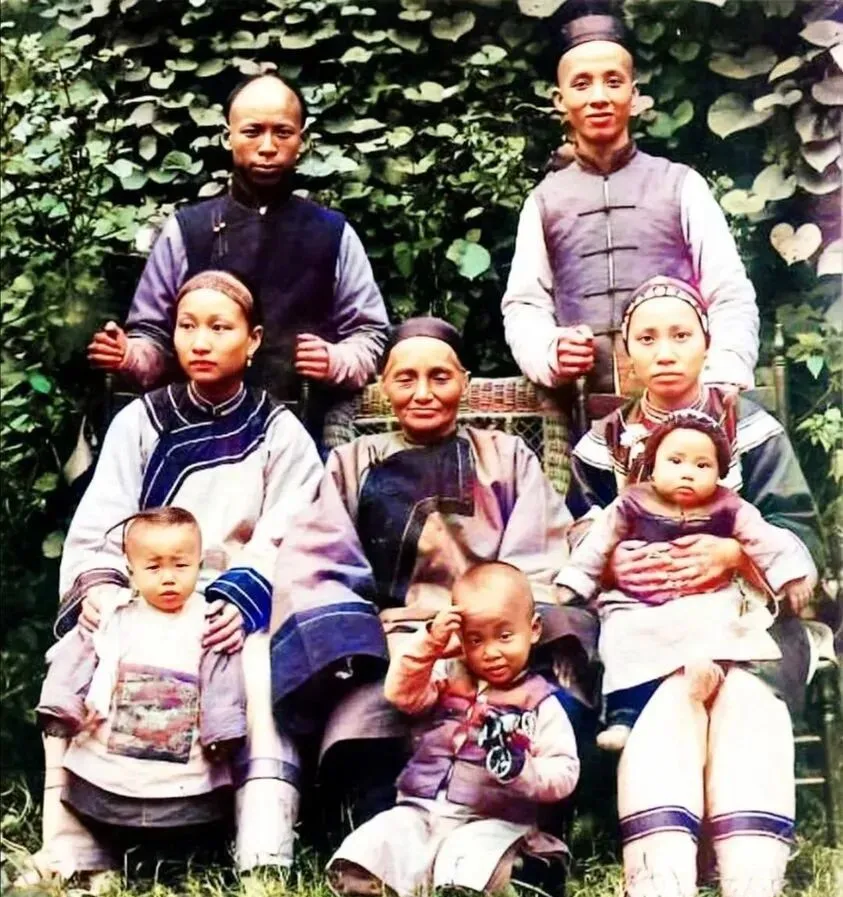 这个热闹的叫大家子合影,老奶奶坐中间,脸圆圆的笑意压着,左右两边儿媳抱着娃,后头站着两个小伙子,身上的坎肩对襟都合体,衣料不算华贵但一水儿熨帖,这一看就是会过日子的人家。